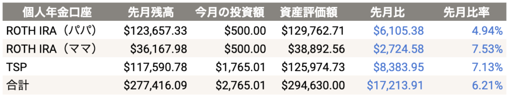 個人年金アカウントは先月よりも合計$17,213.91(6.21%)になりました。