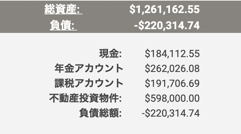 ※ 純資産額に車と529プラン(子供の学資金口座)を含めていません。