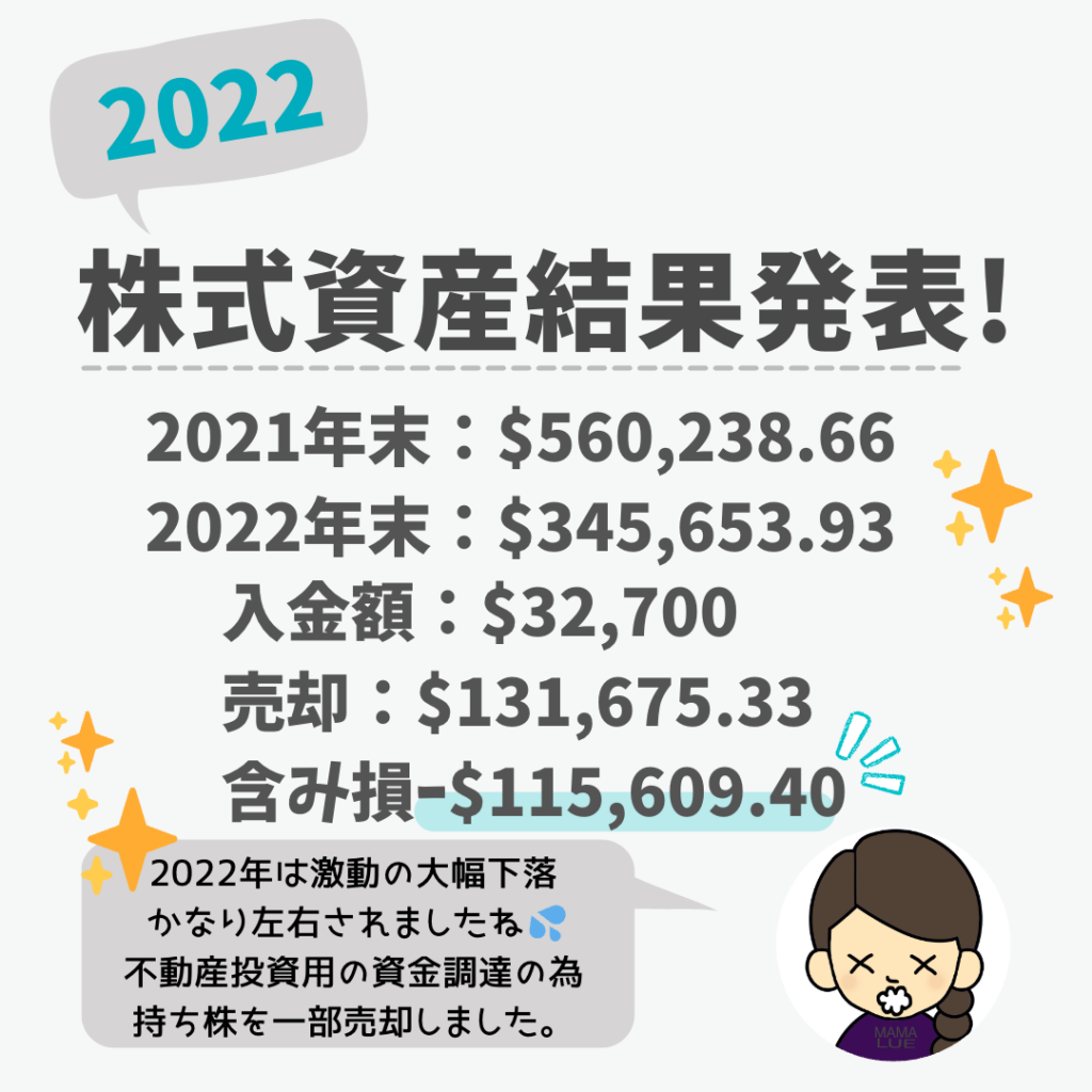 2021年の様子を見て1.4ミリオンドルも達成可能かもと設定したのですが、2022年は株価が暴落で純資産1.4ミリオンは達成することが出来ませんでした。