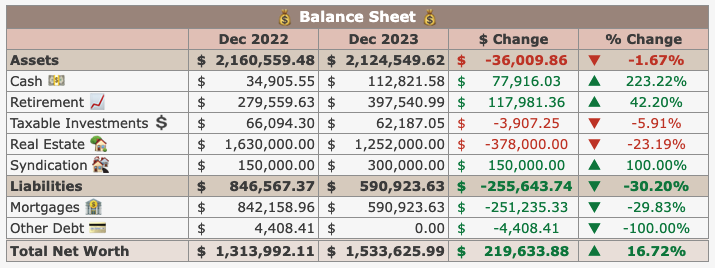 3月にようやくアパートを売却したので不動産資産が減っていますが、2023年の不動産価値は減速したものの資産価値はそれでも上昇しました。
