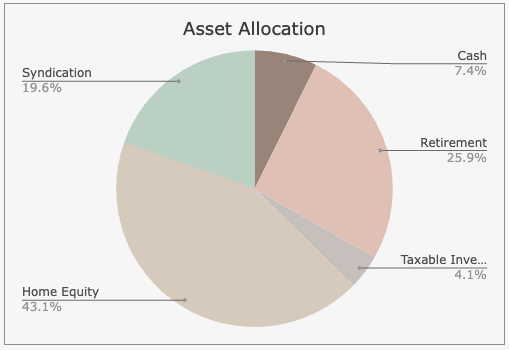 以前までは不動産資産と株式資産がちょうど半分くらいだったのですが、不動産価格の上昇とシンディケーション(不動産)投資に参加したことで不動産資産が圧倒的に多いポートフォリオになっています^^;