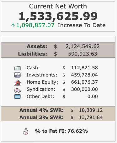 FIREムーブメントを開始した2017年から6年半で純資産が1,098,857.07ドル(252.75%)増えました。