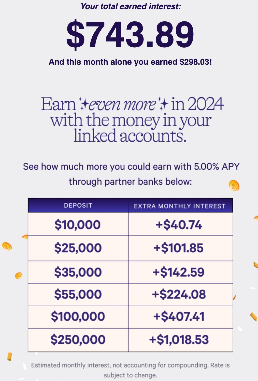 貯めている現金はほぼWealthfrontのHigh Yield Saving Accountに移しました。0.5%のブースト効果もあり、金利が5.5%なので貯金しているお金を働かせることが出来ました。