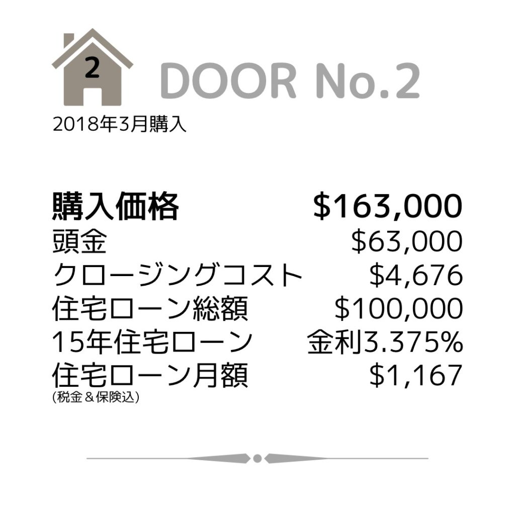この当時よく聞いていたアメリカの人気ファイナンス・ラジオショー、辛口CPAのDave Ramesy(デイブ・ラムジー)さんのアドバイス『住宅は15年ローンで購入し早く完済せよ』を忠実に守り、私の貯金から63,000ドルを頭金として入れ、100,000ドルの15年の固定金利ローンで組むことにしました。