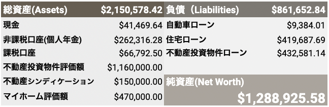純金融資産は非課税&課税口座を合計して$329,108。