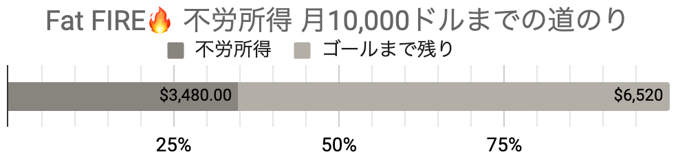 不労所得で考えると、残すところ$6,520($10,000ー$3,480)になりました。こちらもまだ長い道のりです。