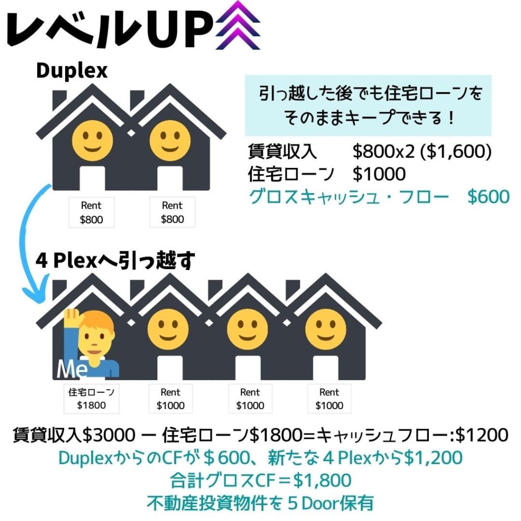 以前住んでいたDuplexからのグロスCFが$600。新たに引っ越した4plexがグロスCF$1200+居住費無料。トータル5Doorを不動産運営してグロスCFが$1800。