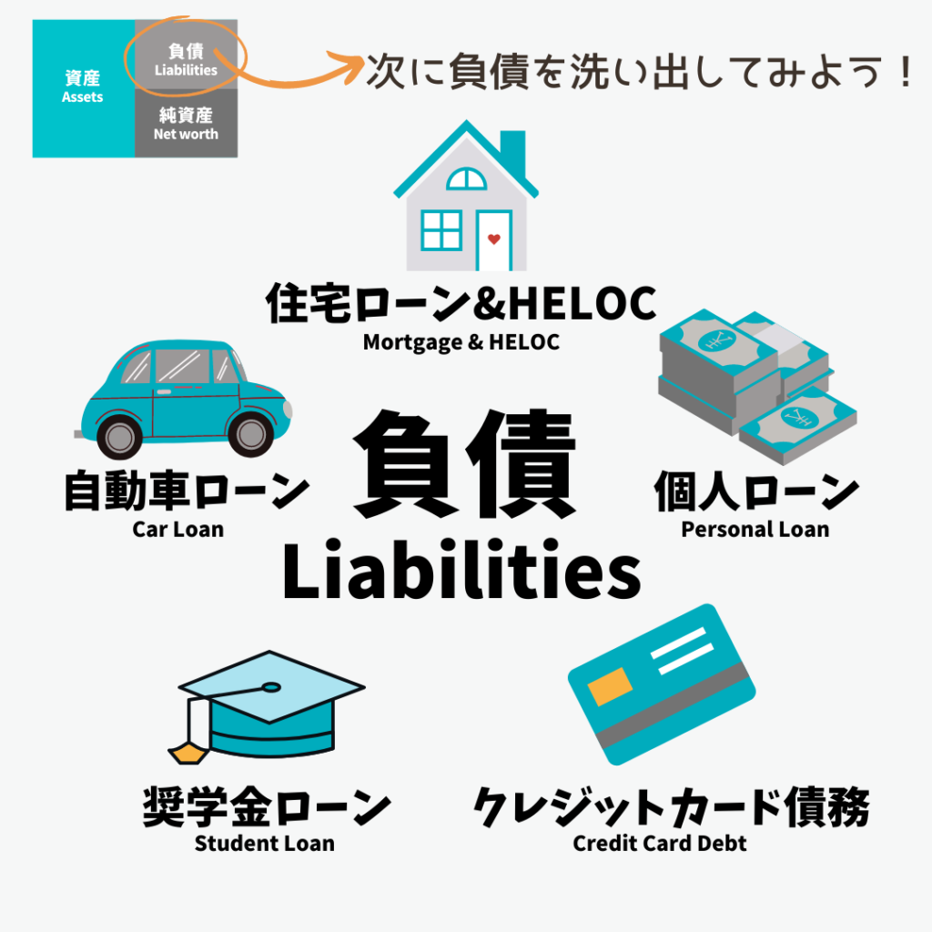 そこからマイホームや車ローンの負債総額250,000ドルを差し引いた額、50,000ドルが純資産になります。