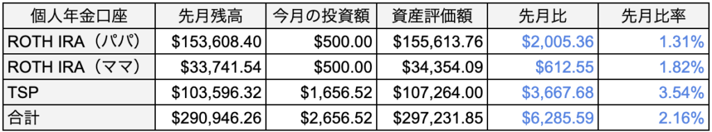 • パパのRoth IRA口座はETFを2004年から積立購入しており、これが我が家の稼ぎ頭