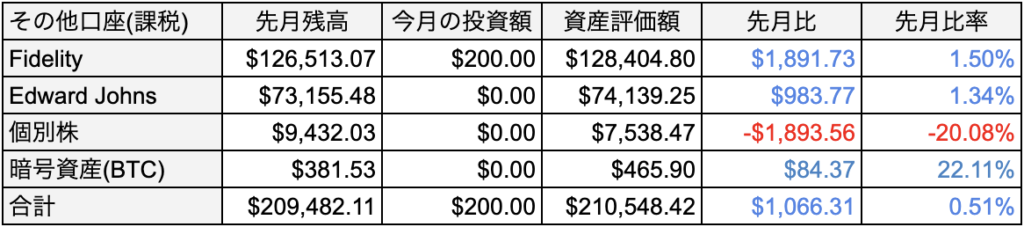 今月は課税アカウントもプラス1,066.31ドルになり、株式のアカウントはトータルでおよそ7,351ドルUPです。