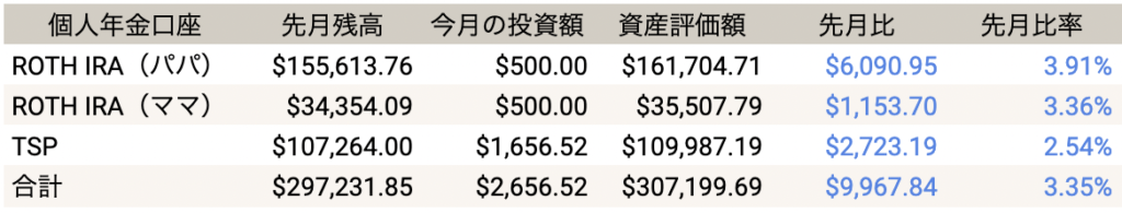個人年金アカウントは合わせて9,967.84ドル(3.35%)増えました!