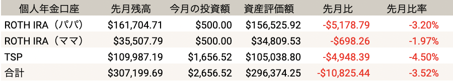 個人年金アカウントは合わせて先月よりも-10,825.44ドル(-3.52%)と大きく減りました。