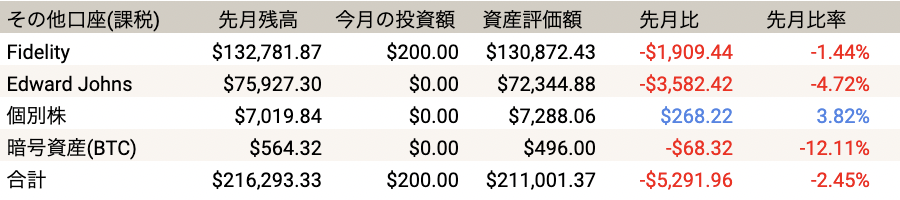 課税アカウントは合わせて先月よりも-$5,291.96(-2.45%)と税制優遇口座と同じく大きく落としています。