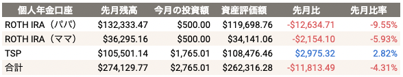 個人年金アカウントは先月よりも合計マイナス$11,813.49(-4.31%)になりました。