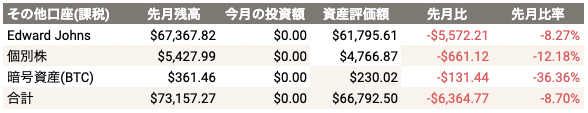 課税アカウントは先月よりも、マイナス$6,364.77(-8.7%)。
