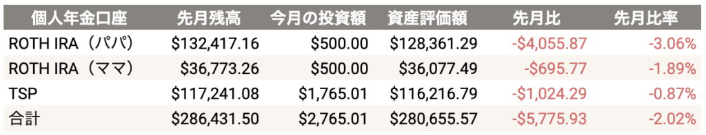 個人年金アカウントは先月よりも合計-$5,775.93(-2.02%)になりました。