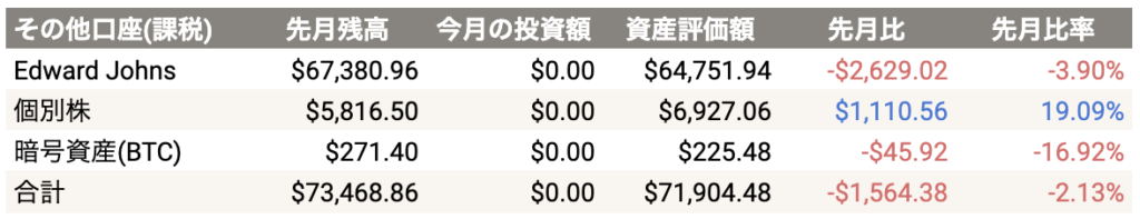 課税アカウントは先月よりも、-$1,564.38(-2.13%)。