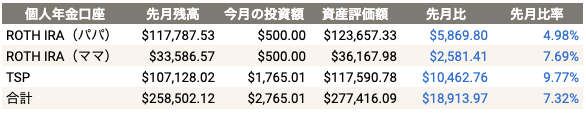 個人年金アカウントは先月よりも合計$18,913.97(7.32%)になりました。