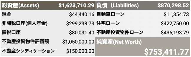 不動産シンディケーションに資産を分配したので、現在の純金融資産は合計$379,270(達成率22.3%)に下がりました。