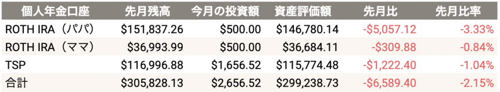 個人年金アカウントはトータルで先月よりもマイナス6,589.40ドル(-2.15%)になりました。