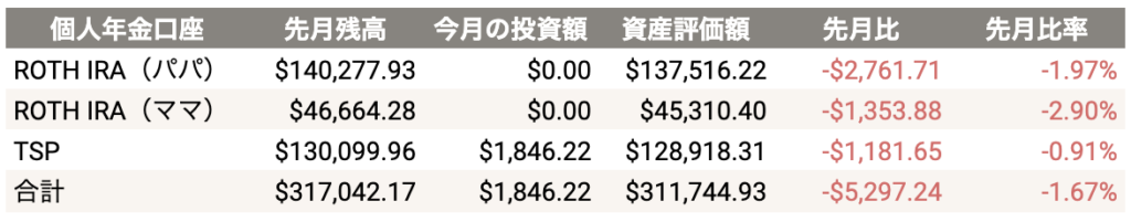 夏に米軍リタイアとなるためRoth TSPのMax Out投資は難しいかと思われますが、C Fund(80%)、S Fund(10%)、I Fund(10%)の割合で積立投資を継続します。