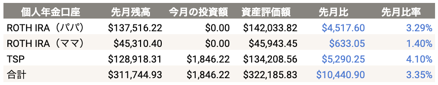 夏に米軍リタイアとなるためRoth TSPのMax Out投資は難しいかと思われますが、C Fund(80%)、S Fund(10%)、I Fund(10%)の割合で積立投資を継続します。
