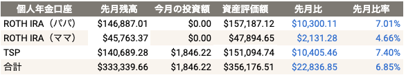 夏に米軍リタイアとなるためRoth TSPのMax Out投資は難しいかと思われますが、C Fund(80%)、S Fund(10%)、I Fund(10%)の割合で積立投資を継続します。