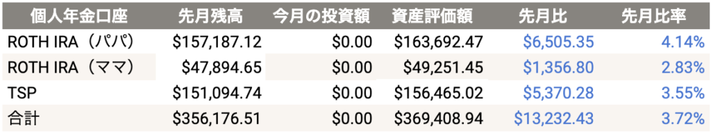 夏に米軍リタイアとなるためRoth TSPのMax Out投資は難しいかと思われますが、C Fund(80%)、S Fund(10%)、I Fund(10%)の割合で積立投資を継続します。