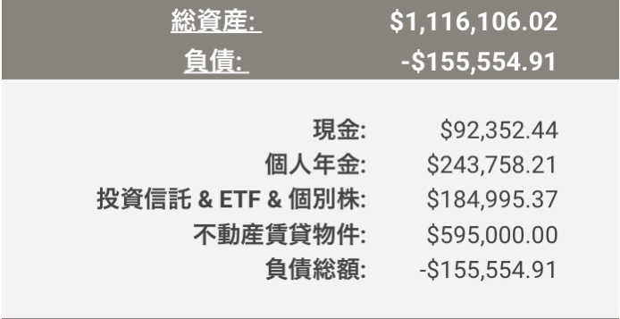 - 現金にはEmergency Fund(生活防衛費)と不動産投資の頭金等が含まれています