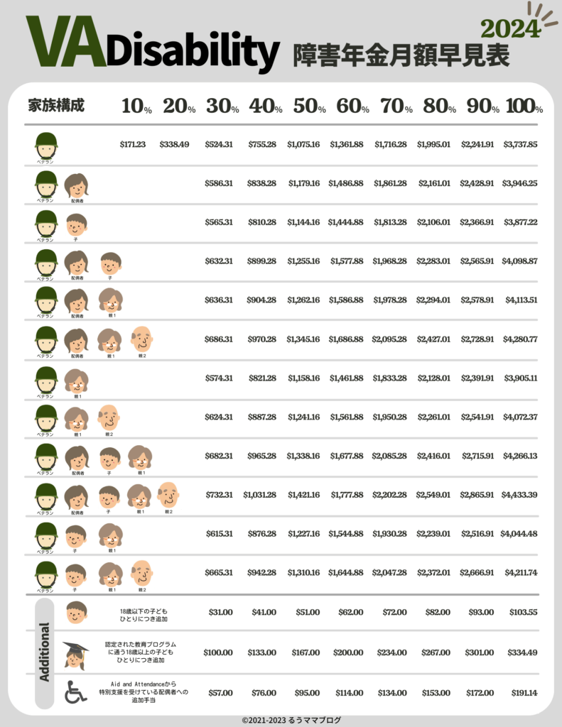 このVA Disabilityレートは一般情報公開されているので、「VA Disability Pay 2024」などとGoogle検索すると金額がでてきます。